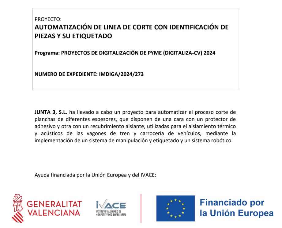 JUNTA 3 S.L. ha sido beneficiaria del Fondo Europeo de Desarrollo Regional, cuyo objetivo es promover el desarrollo tecnológico, la innovación y una investigación de calidad, gracias al cual ha puesto en marcha un Plan de Acción con el objetivo de mejorar la competitividad empresarial apoyada en la innovación de la pyme, durante el año 2024. Para ello ha contado con el apoyo del Programa Pyme Innova de la Cámara de Comercio de Valencia.
